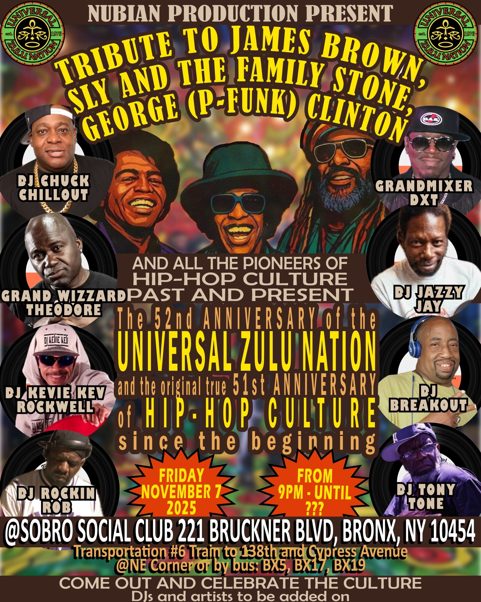 “Universal Zulu Nation 52nd Anniversary: A Funk & Hip Hop Cultural Experience — Honoring the Fathers of Funk James Brown, Sly & The Family and George Parliament Funkadelic Clinton
